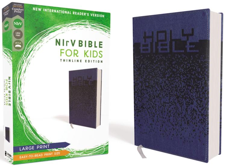 The NIrV Bible for Kids, Large Print is perfect for those looking for an easy-to-carry, extremely readable Bible for children and developing readers.Features Include:Easy-to-read 11.4-point print sizeExclusive Zondervan Comfort Print typefaceComplete text of the New International Reader’s Version, written at a third-grade reading level just for developing readersPresentation page for gift givingRibbon markerLeathersoft cover with attractive design