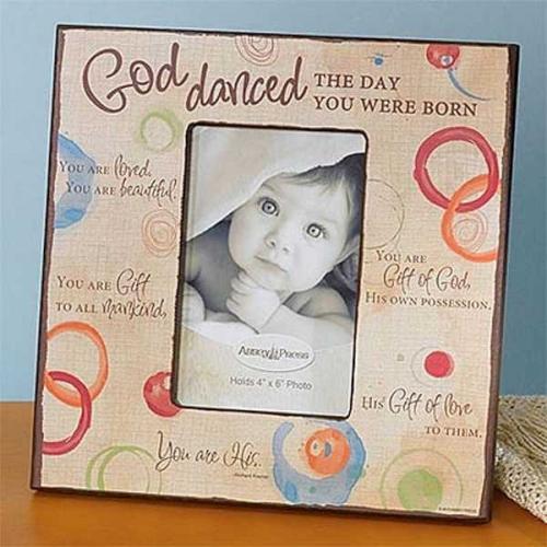 Hardboard frame features a printed facing offering a colorful contemporary design and an opening for a 4″ x 6″H photo. Easel backer. Protective white box.