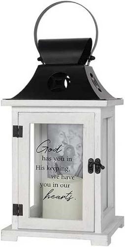 Our Picture Frame Lanterns are made from quality composite wood and a black metal top. They feature a built-in 4″ x 6″ picture frame along with an automatic timer which runs for 6 hours on and 18 hours off(3-AAA batteries are NOT included) and are inscribed with sentimental quotes. DO NOT use fire burning candles in the lanterns. Suitable for hanging or free-standing use inside. Recommended as an accent in floral arrangements for many occasions.