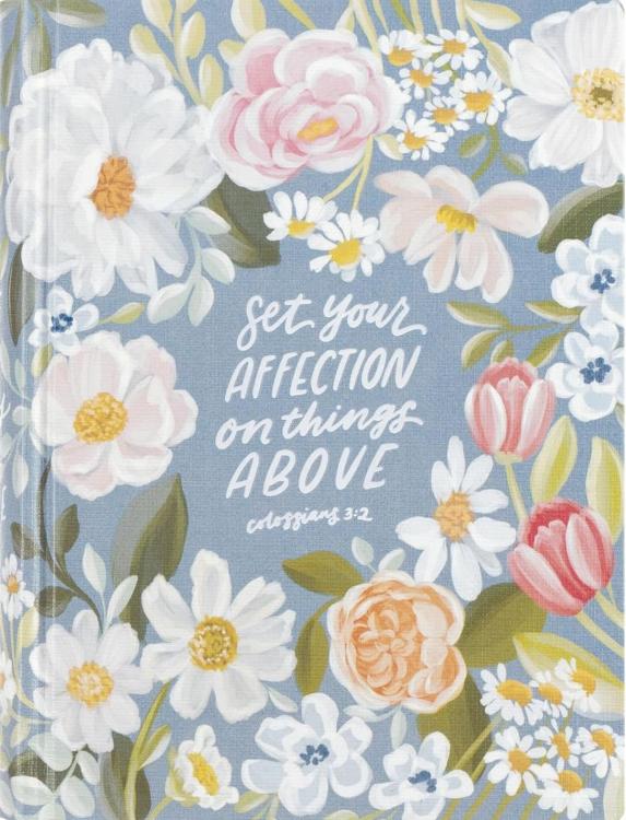 An artistically rendered composition of vivid florals burst from the front panel of this hardcover note-taking Bible. The floral front panel is uniquely curved on the left side, connecting to the similarly curved solid blue faux leather panel that wraps around the spine and back. A small blue patch on the front floral panel that holds the silver foiled title is reinforced with blue topstitching.