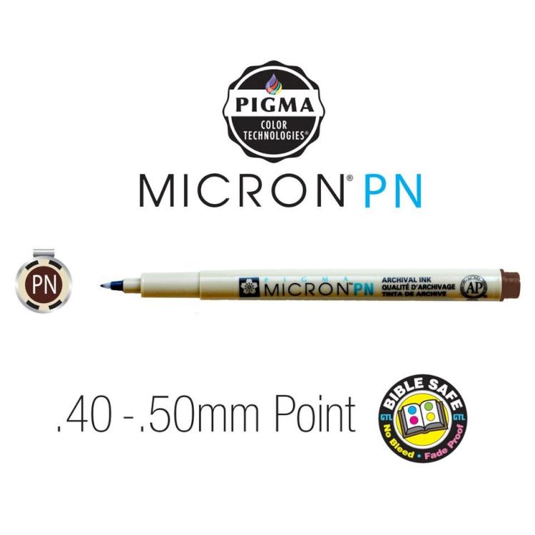 Loyal Micron users requested a nib suitable for everyday and multi-purpose use. Introducing the Pigma Micron PN – its durable Plastic Nib (PN) provides a fine or medium line width based on your personal writing pressure and the angle of the nib during use. Achieve widths between 0.40 MM skip-free lines and crisp consistent results every time!
