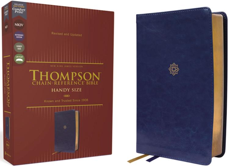 An easy-to-learn, easy-to-use tool for in-depth Bible studyBeloved and acclaimed for more than five generations, the Thompson(R) Chain-Reference(R) Bible is unparalleled in its ability to enrich personal devotions, topical study, and sermon preparation. This unique reference Bible enables you to search the breadth of Scripture’s teachings on thousands of topics and allows you to follow those topics throughout the entire Bible. With over 100,000 references, covering over 8,000 topics, the chain-reference system is an ideal tool for comprehensive topical study. The Thompson Chain-Reference Bible also offers a library of additional study resources that allows readers to interpret the Bible using related scripture passages rather than consulting a commentary.The NKJV Thompson Chain-Reference Bible, Handy Size is printed in the NKJV Comfort Print(R) typeface for easy reading. Expertly designed specifically to be used for the New King James Version (NKJV) text, Comfort Print offers an easier reading experience that complements the translation. This Bible also features a fresh, two-color design that preserves the original look of the chain-reference system, while making each page cleaner and easier to read.Features:Complete text of the New King James Version (NKJV)Easy-to-understand chain-reference system with over 100,000 referencesAlphabetical and numerical indexes highlight study materials for over 8,000 topics, each with its own topic number, for exhaustive topical studyAn extensive study resource section includes biographical sketches, illustrated studies of the Bible, a concordance, Bible harmonies, and many other helpful study toolsFresh, two-color page design66 book introductions16-page full-color map section with map indexLine-matched text for enhanced readabilityWords of Jesus in redPresentation page for gift-givingPersonal size for easy carryingGilded page edgesTwo double-sided satin ribbon markers, each 3/8-inch wideLeathersoft cover lies flat when openExclusive NKJV Comfort Print typefacePrint size: 8